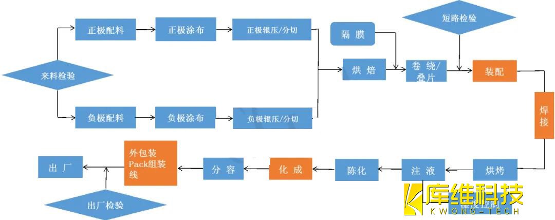鋰電池制造工藝的基本流程可以分為前中后三段,即前段的配料、涂布、輥壓、分切;中段的卷繞、疊片、裝配、焊接、注液、封口;后段的化成、分容、PACK、倉儲(chǔ)物流.