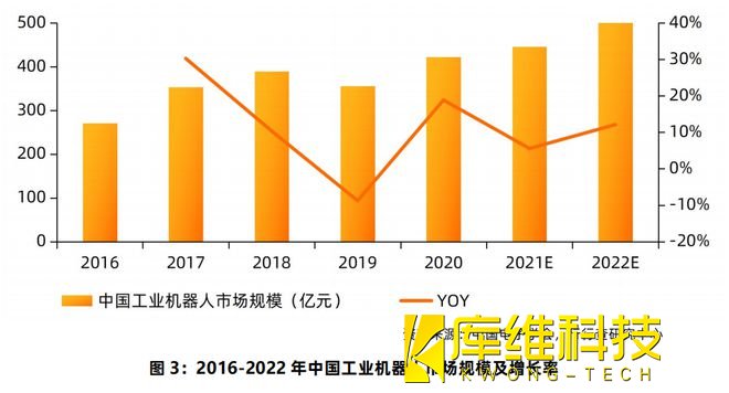 工業(yè)機器人應用市場。而據國家統(tǒng)計局公布的數(shù)據顯示,繼2020年全國工業(yè)機器人產量突破20萬套大關后,2021年全國工業(yè)機器人產量成功突破30萬套大關,達到36.6萬套,同比增長44.9%,創(chuàng)歷史新紀錄。伴隨著國內工業(yè)制造領域的生產智能化改造和數(shù)字化升級的浪潮,工業(yè)機器人將繼續(xù)保持樂觀的發(fā)展前景,預計2022年我國工業(yè)機器人市場規(guī)模將迫近500億元。