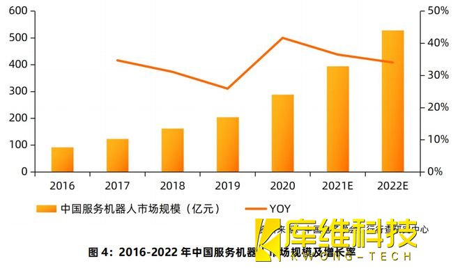 2021年我國服務機器人市場規(guī)模預計達到393.3億元,2016-2021年的年均復合增速達34%,市場規(guī)模總體增速高于工業(yè)機器人。近年來,服務型機器人產品的消費需求不斷升級、消費群體日益擴大,C端市場應用滲透率不斷提升,預計2022年我國服務機器人的市場規(guī)模將達到500-550億元。