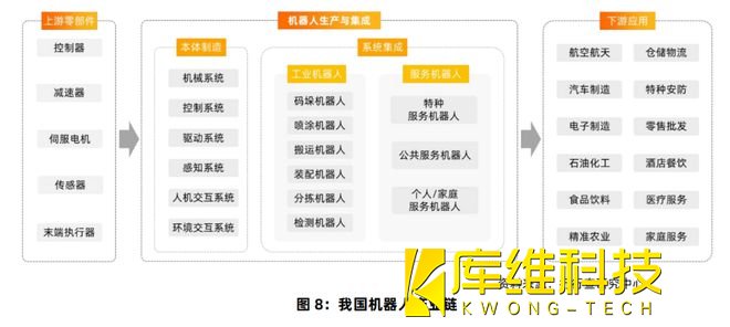 中游本體制造和系統(tǒng)集成:涵蓋機器人本體制造商以及面向應用部署服務的系統(tǒng)集成商。其中,本體制造商在機器人本體結構設計和加工制造的基礎上,通過集成上游零部件實現(xiàn)機器人整機的生產;系統(tǒng)集成商則成為連接生產企業(yè)和客戶的橋梁,通過面向具體用戶需求的定制化集成開發(fā),實現(xiàn)機器人在特定場景中的實際布署。