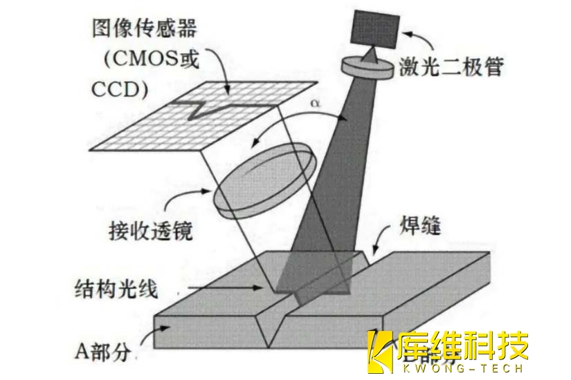 焊縫跟蹤技術(shù)通常基于傳感器(如激光傳感器或視覺(jué)傳感器)來(lái)實(shí)時(shí)采集焊縫的圖像信息,然后通過(guò)圖像處理和分析來(lái)識(shí)別焊縫的位置和形狀。控制器根據(jù)這些信息調(diào)整執(zhí)行機(jī)構(gòu)(如焊接機(jī)器人的焊槍),實(shí)現(xiàn)對(duì)焊縫的精確跟蹤。其中,激光焊縫跟蹤技術(shù)利用激光三角形測(cè)量法,通過(guò)激光器發(fā)射線激光照射到工件表面,經(jīng)過(guò)漫反射后,激光輪廓在CCD或CMOS傳感器上成像。控制器對(duì)采集到的圖像進(jìn)行處理分析,獲取焊縫的位置,用于修正焊接軌跡或引導(dǎo)焊接,如圖所示。視覺(jué)圖像法主要基于普通視覺(jué)的焊縫跟蹤使用光學(xué)攝像頭或工業(yè)相機(jī)對(duì)焊縫進(jìn)行拍攝,獲取焊縫的圖像信息,然后利用圖像處理算法對(duì)圖像進(jìn)行分析和處理,提取出焊縫的位置和形狀信息。