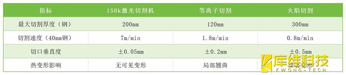 傳統(tǒng)等離子切割或水刀工藝在超厚板(≥40mm)加工中普遍面臨效率低、熱影響區(qū)大、切口粗糙等問題。而150k激光切割機通過以下技術參數(shù)實現(xiàn)跨越式升級: