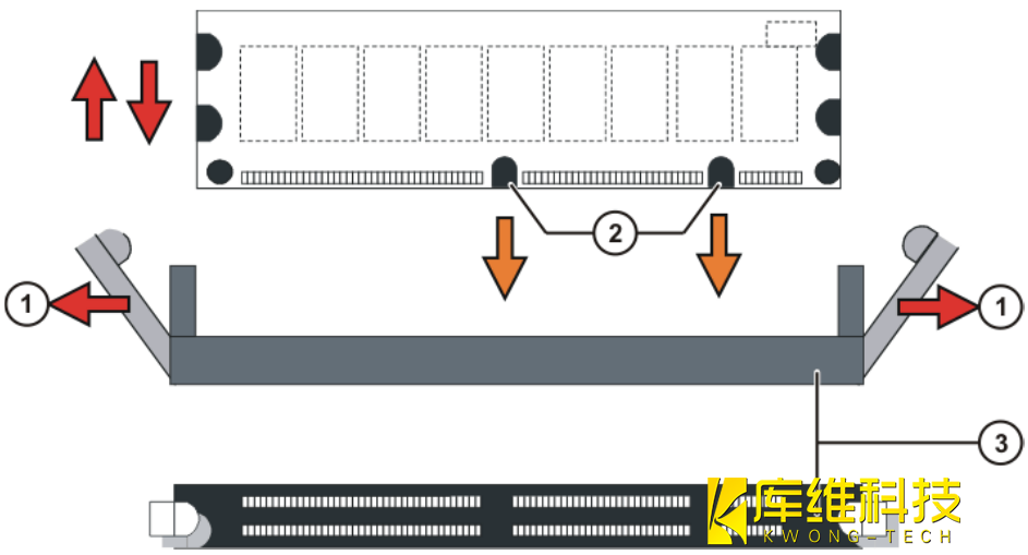 5. 將 RAM 模塊小心地推入插座 (3) 內(nèi),其中需注意編碼缺口 (2) 的具體位置.