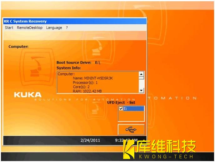 2. 插上具有起動功能的庫卡 U 盤,然后重啟控制系統。
