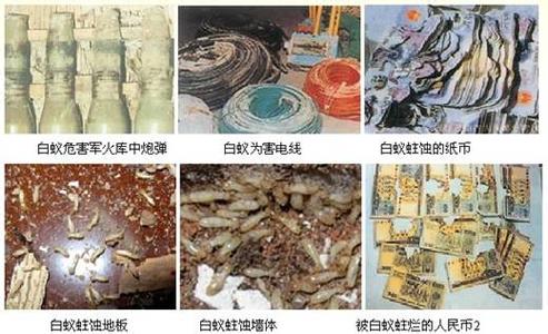 白蟻還能危害圖書、文物、織物、武器、帳冊、錢幣、地下電纜等,造成重大損失。古廟宇的大梁被蛀斷,地下通訊電纜被蛀造成電信中斷,銀行金庫也難以幸免,人民幣被蛀等。